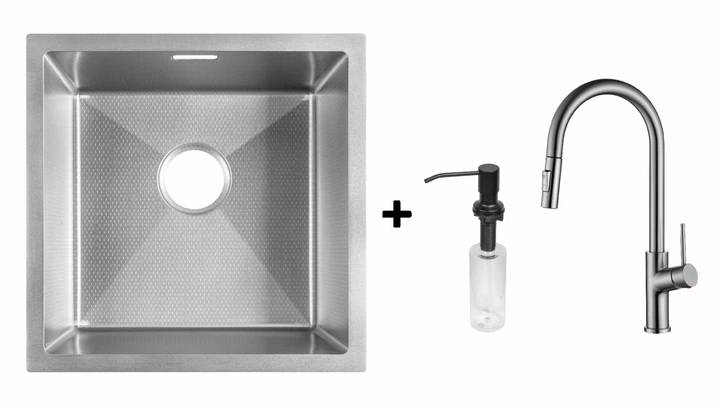 Комплект Gunter&Hauer: Кухонна мийка Olef 4522 Inox Honey + Кухонний змішувач MOND Br + Дозатор SOAP DISPENSER Black
