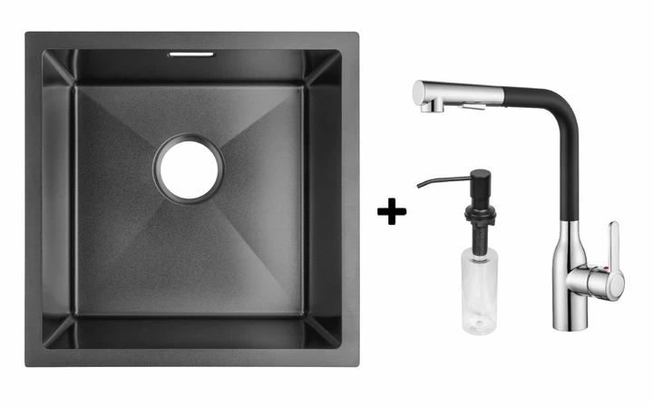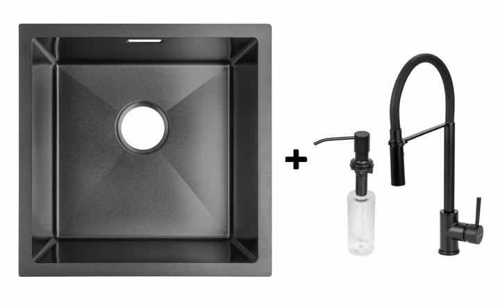 Комплект Gunter&Hauer: Кухонна мийка Olef 4522 Black + Кухонний змішувач ROBUST Black + Дозатор SOAP DISPENSER Black