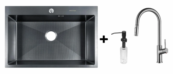 Комплект Gunter&Hauer: Кухонна мийка Odenbach 7522 Black + Кухонний змішувач LUFT Br + Дозатор SOAP DISPENSER Black