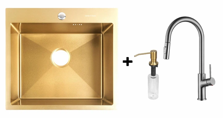 Комплект Gunter&Hauer: Кухонна мийка Mindel 5522 Gold + Змішувач MOND Br + Дозатор SOAP DISPENSER Black