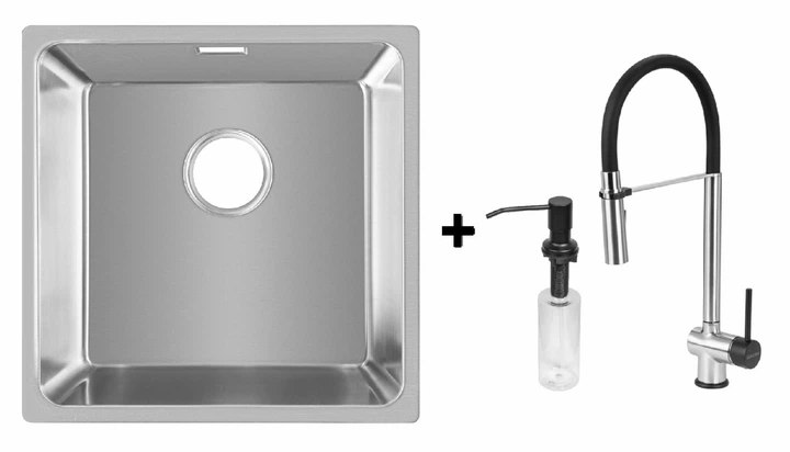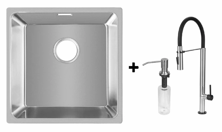Комплект Gunter&Hauer: Кухонна мийка Felda 4420 IX (44x44 см) + змішувач BRISE Brush + Дозатор SOAP DISPENSER Black