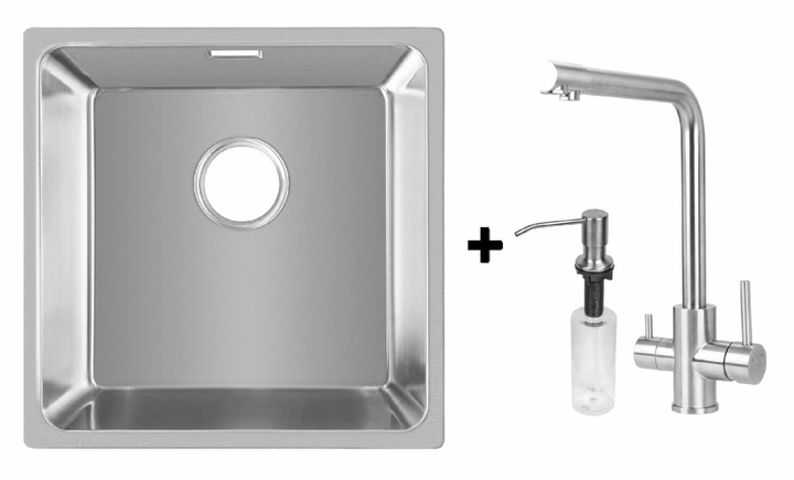 Комплект Gunter&Hauer: Кухонна мийка Felda 4420 IX (44x44 см) + змішувач PERLE Brush + Дозатор SOAP DISPENSER Inox