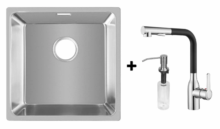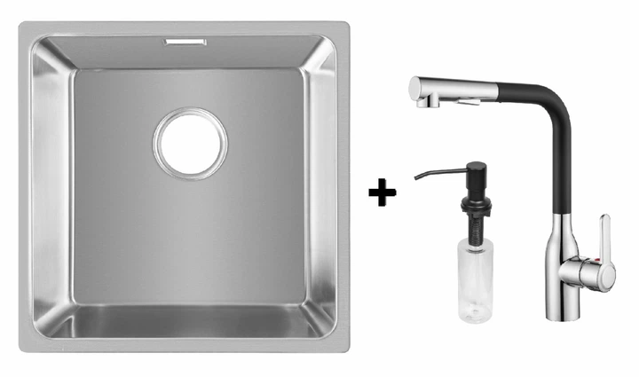 Комплект Gunter&Hauer: Кухонна мийка Felda 4420 IX (44x44 см) + змішувач DUNKEL Cr-Bl + Дозатор SOAP DISPENSER Black