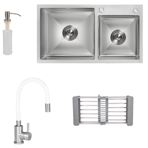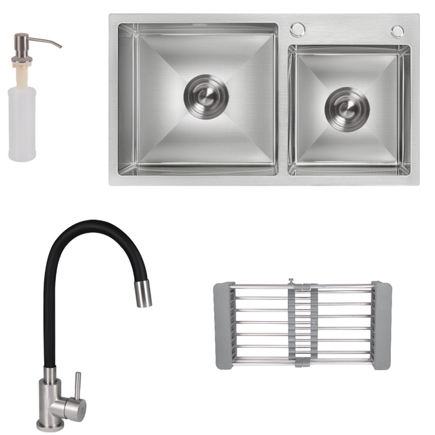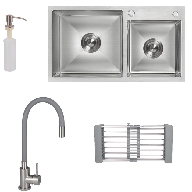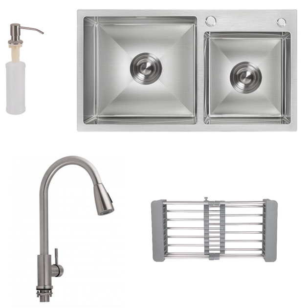 Набір 3 в 1 мийка для кухні із двома чашами інтегрована Lidz Handmade H7843 + Змішувач для кухні Lidz Aria 015F3 + дозатор S