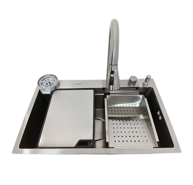 Мийка з нержавіючої сталі з функцією водоспад AQUAMILL 7246 PVD чорна decor + змішувач з висувною лійкою + рінзер + дозатор