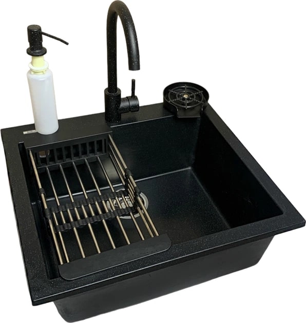 Adamant Набір кухонний Univer, штучний камінь, квадрат, без крила, 560х500х200мм, чаша - 1, врізна, чорний + змішувач + доза
