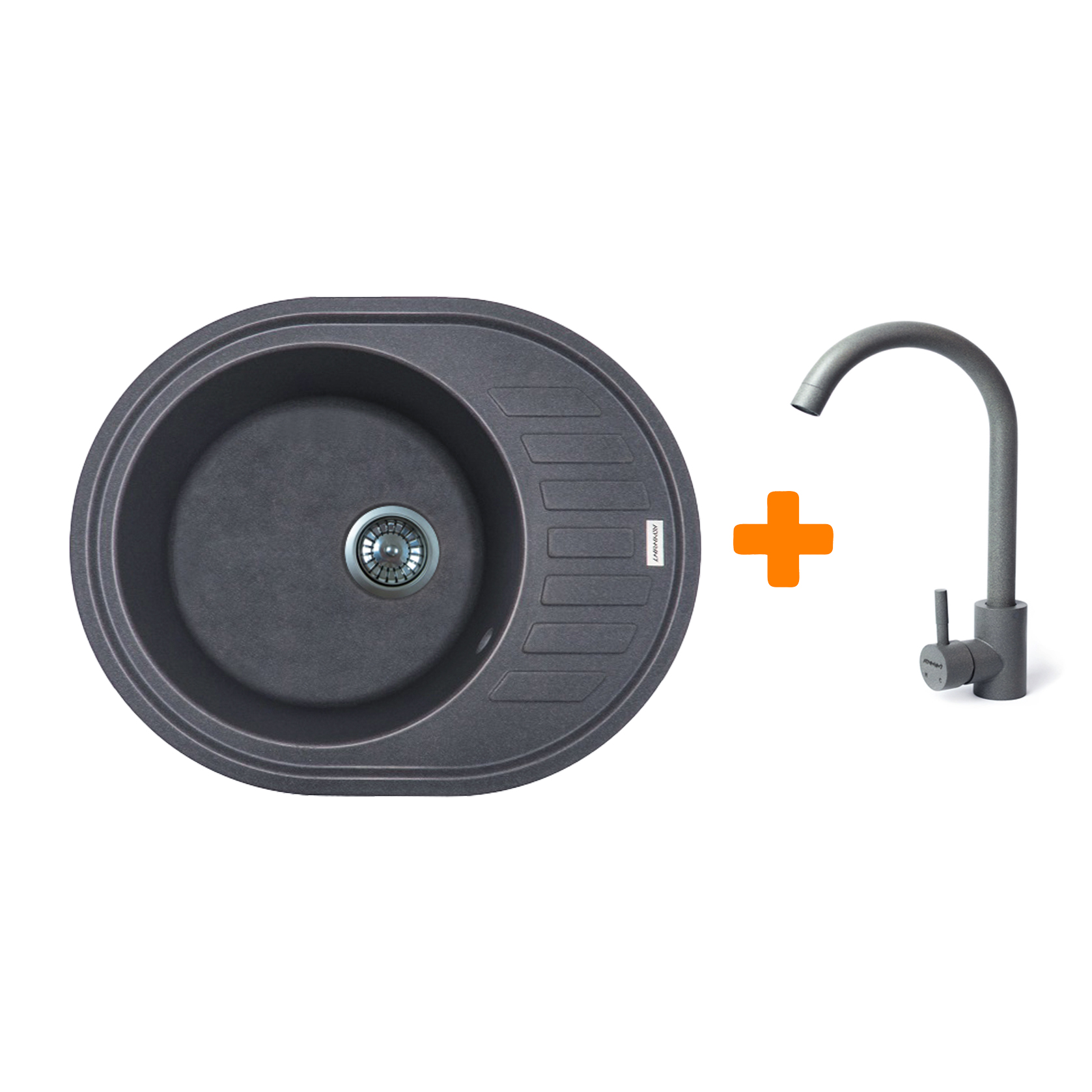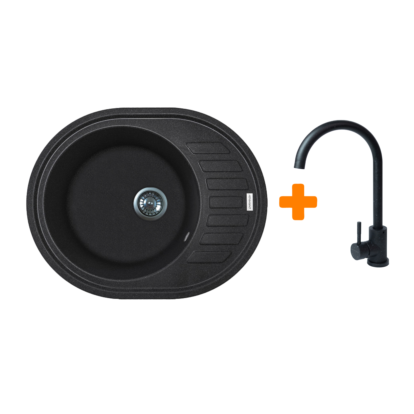 Adamant Мийка кухонна Ovum, штучний камінь, овальна, з крилом, 615х495х200мм, чаша - 1, врізна, чорний + змішувач E-18242969