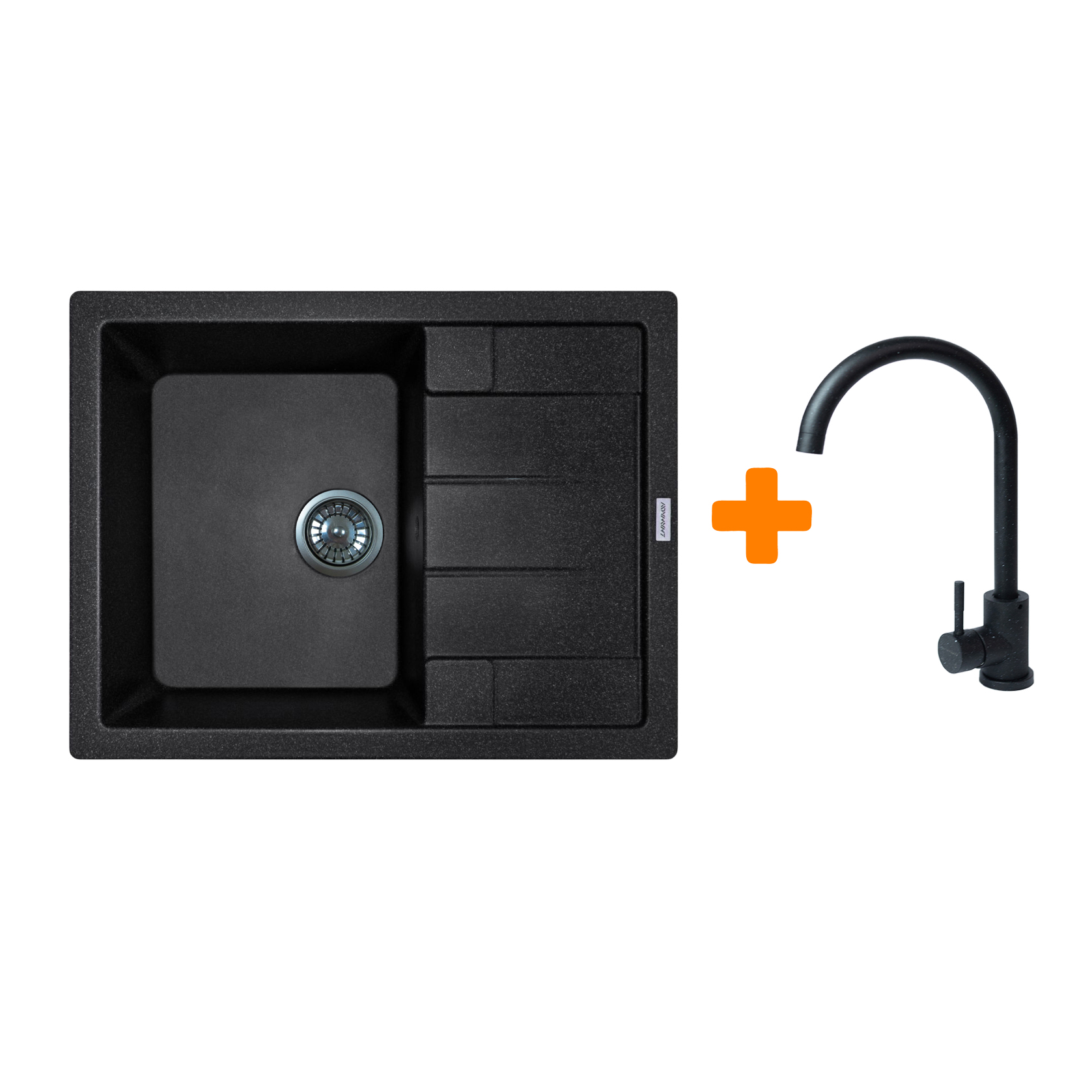 Adamant Набір кухонний Anila, штучний камінь, прямокут., з крилом, 645х495х200мм, чаша - 1, врізна, чорний + змішувач та доз