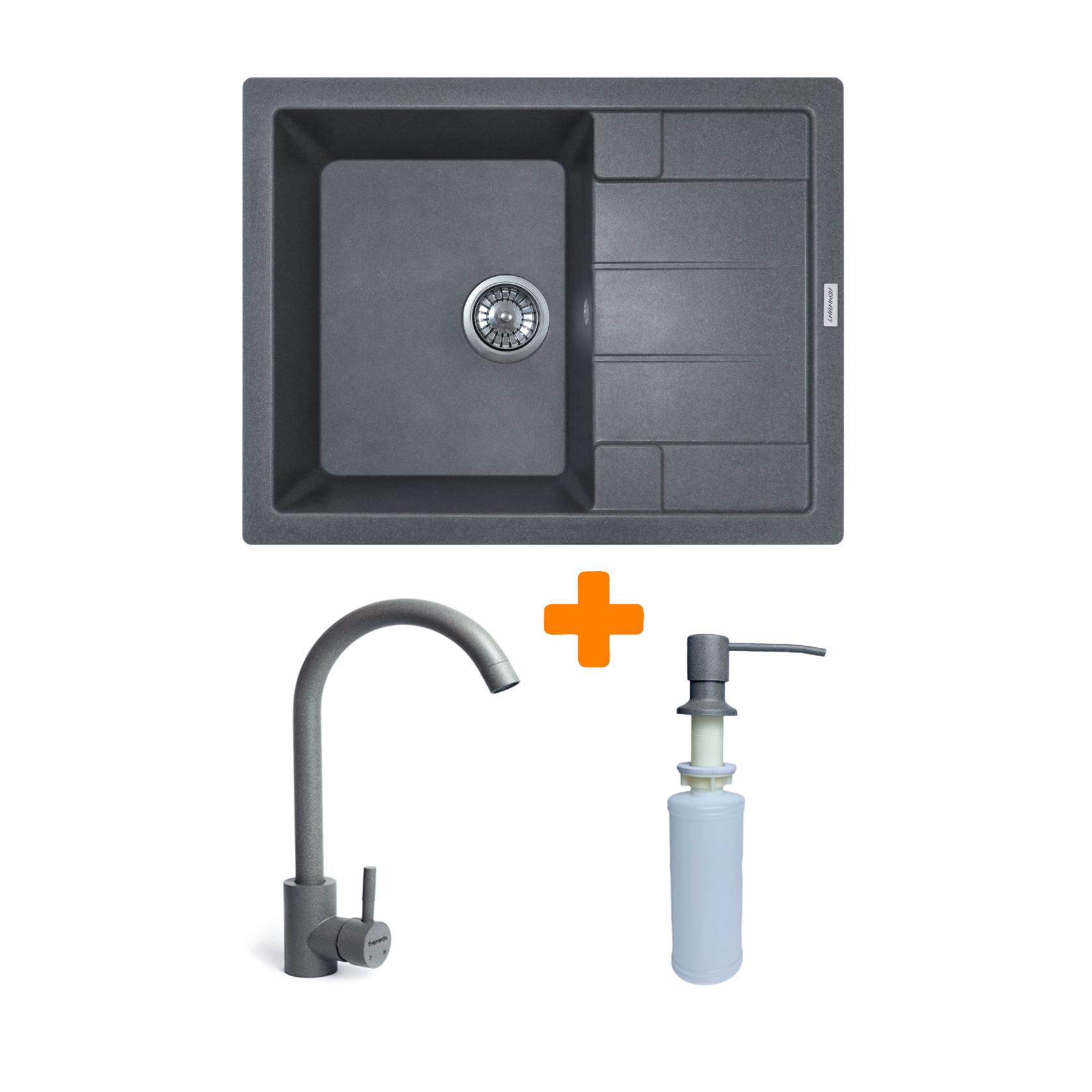 Adamant Набір кухонний Anila, штучний камінь, прямокут., з крилом, 645х495х200мм, чаша - 1, врізна, сірий + змішувач та доза
