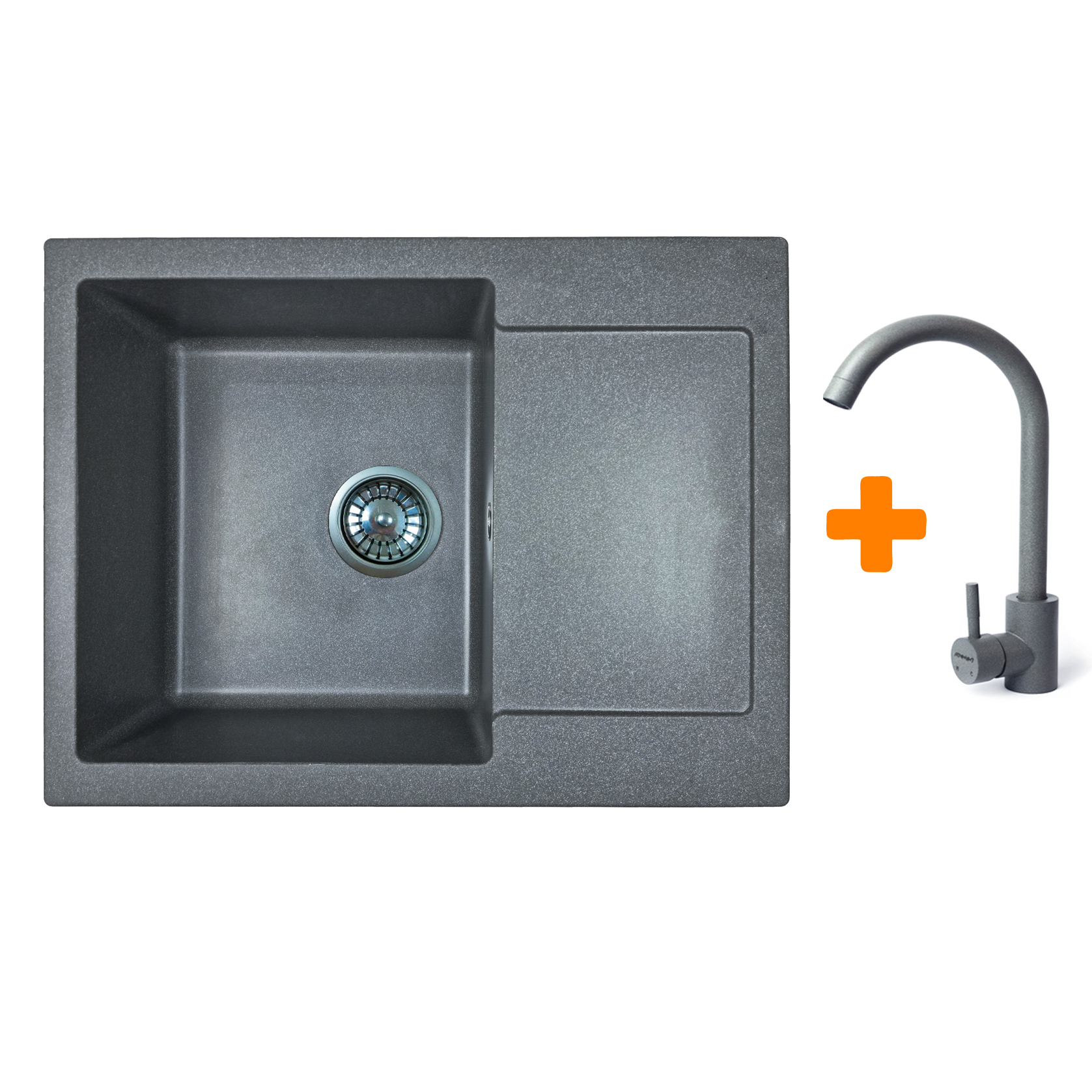 Adamant Набір кухонний Anila, штучний камінь, прямокут., з крилом, 645х495х200мм, чаша - 1, врізна, сірий + змішувач E-18249