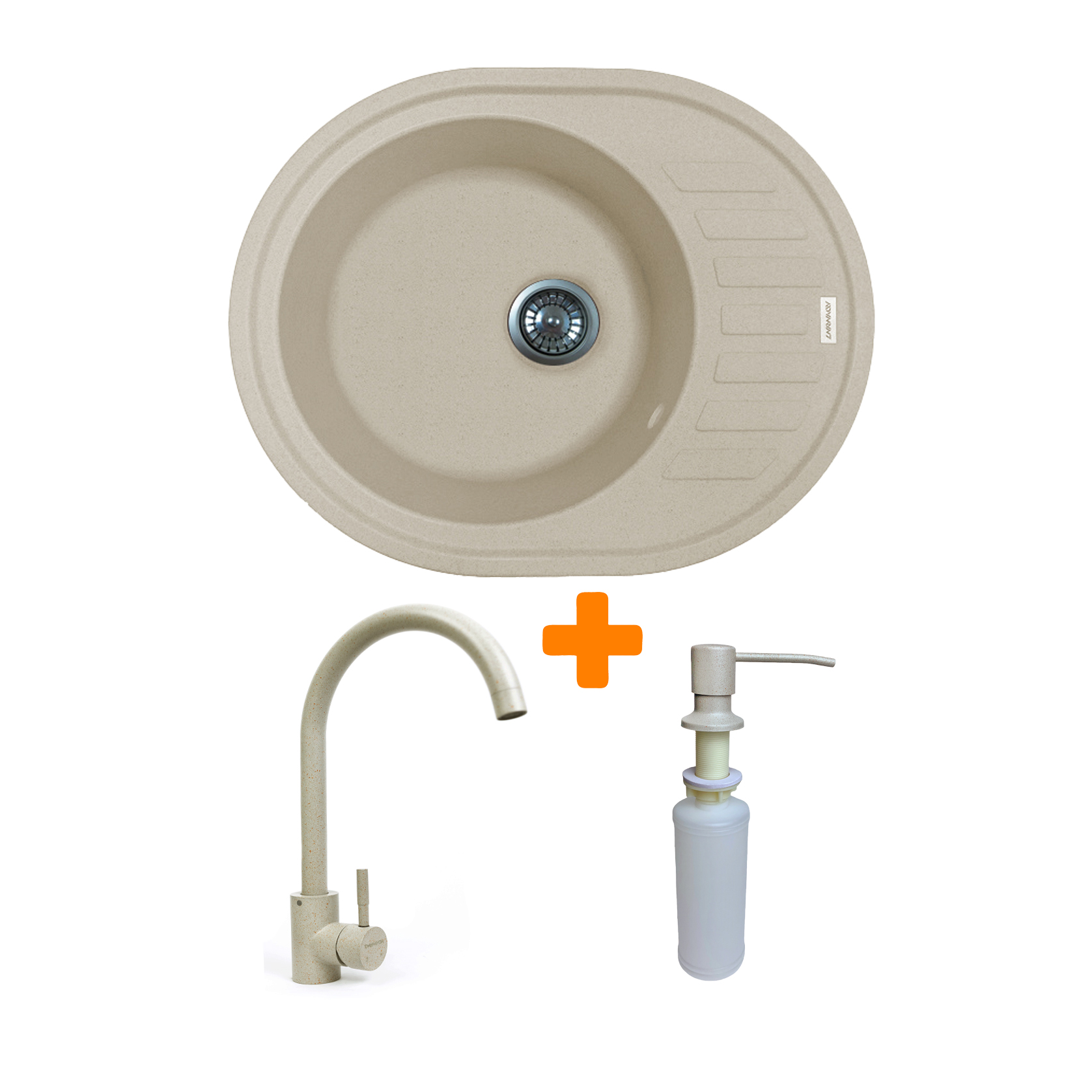 Adamant Набір кухонний Ovum, штучний камінь, овальна, з крилом, 615х495х200мм, чаша - 1, врізна, Avena + змішувач та дозатор