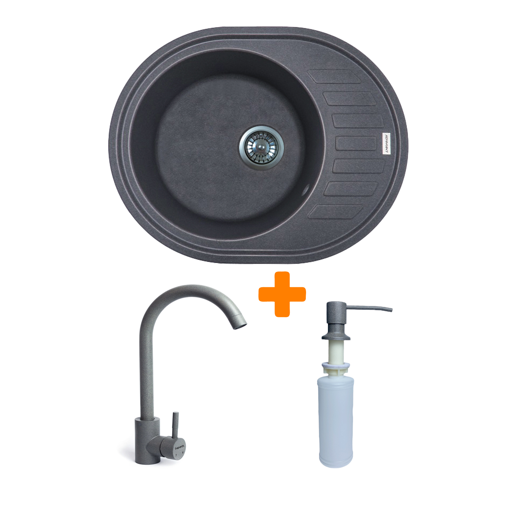 Adamant Набір кухонний Ovum, штучний камінь, овальна, з крилом, 615х495х200мм, чаша - 1, врізна, сірий + змішувач та дозатор