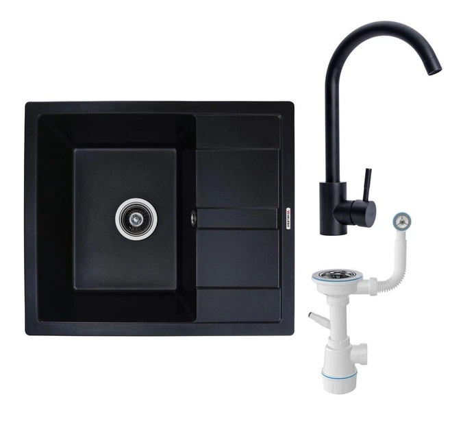 Гранітне миття зі змішувачем та сифоном Valeso з бічним крилом на одну чашу чорного кольору Aria 5851