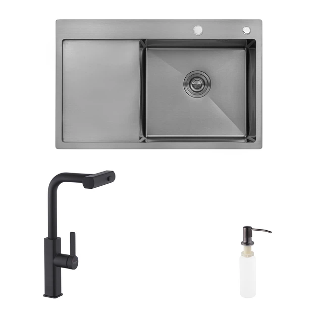 Комплект кухонна мийка Kroner Schwarze-7848LHM PVD + змішувач Edelstahl Klassisch-PVD03817BLK + дозатор Spender-026