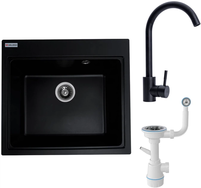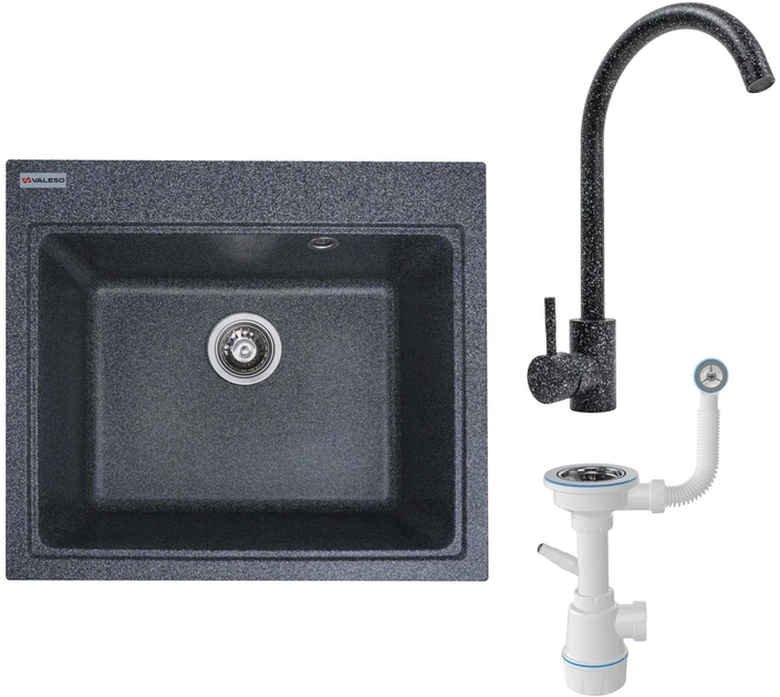Кухонна мийка граніт VALESO Vesta 5852 чорна з сифоном + змішувач кухонний