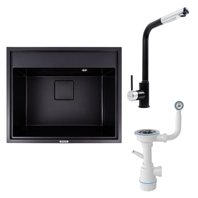 Комплект: Мийка гранітна 6050 SHERLIT VALESO + Змішувач Q411MB + Сифон (Чорний)