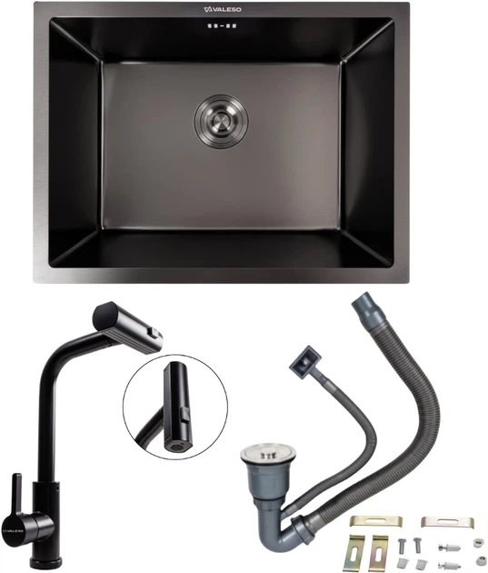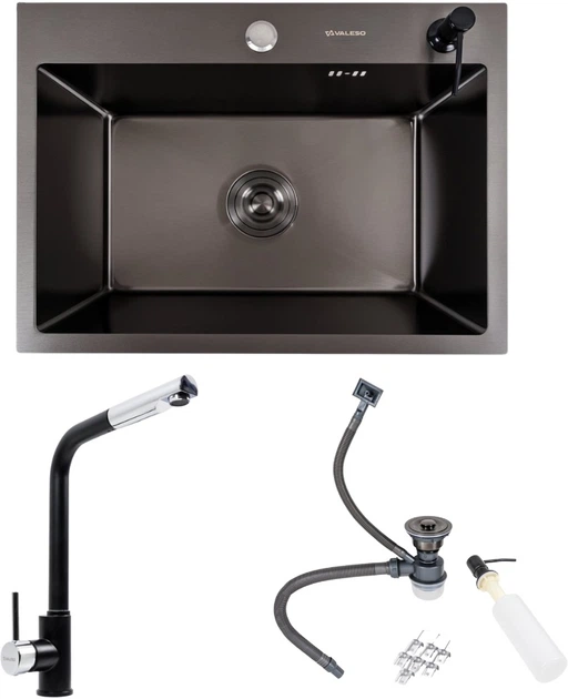 Кухонний комплект: Мийка Valeso Handmade (58x43 см) PVD чорна + Змішувач Q411MB