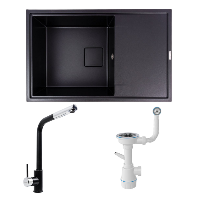 Комплект: Мийка гранітна 6050 SHERLIT VALESO + Змішувач Q411MB + Сифон (Чорний)