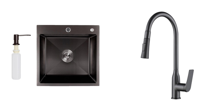 Мийка для кухні з нержавіючої сталі Lidz MVP5050B із змішувачем з витяжною лійкою та дозатором для мила Графіт