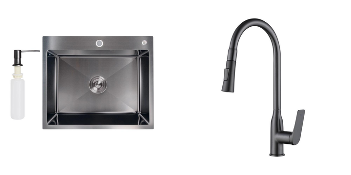 Мийка для кухні з нержавіючої сталі Lidz MVP6050B із змішувачем з витяжною лійкою та дозатором для мила Графіт