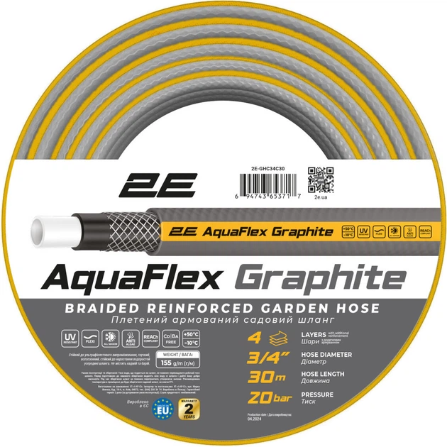 Шланг для поливу 2E AquaFlex Graphite 3/4, 30м, 4 шари, 20бар -10+50°C (2E-GHC34C30)