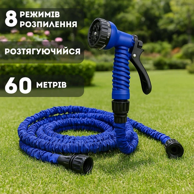 Садовий шланг із 8 режимами 60 м, гнучкий, що розтягується, для поливу та миття, синій