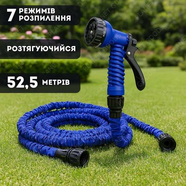 Садовий шланг із 8 режимами 52.5 м, гнучкий, що розтягується, для поливу та миття, синій