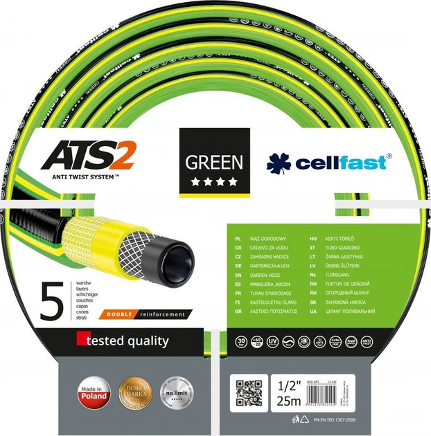 Садовий шланг Cellfast Green ATS2 5/8" (15 мм) п’ятишаровий армований ПВХшланг 25 м з подвійним хрестовотрикотажним плетіння