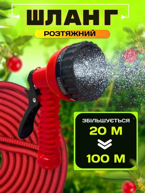 Садовий шланг розтяжний з розпилювачем, 20–100 м (200 FT) , 7 режимів, армований, для поливу та миття