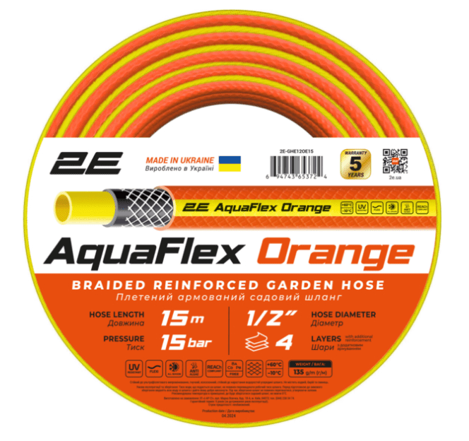 Шланг садовий 2Е AquaFlex Orange 1/2“ 15м (2E-GHE12OE15)