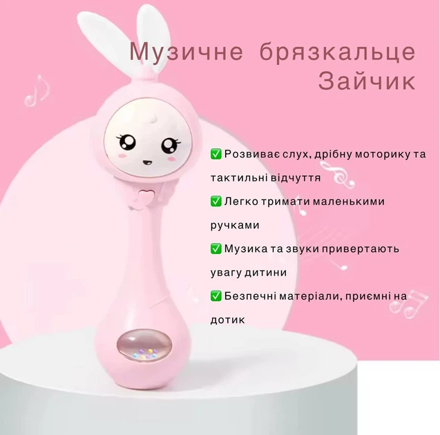Іграшка інтерактивна, брязкальце Зайчик (роза кварц) музична розвиваюча, для малюків
