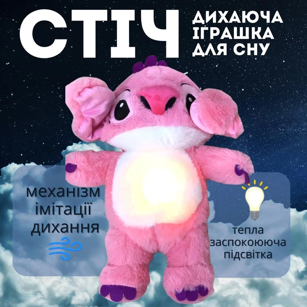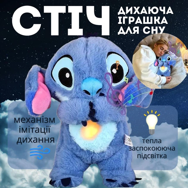 М'яка іграшка нічник дихаючий Веселий Стіч дихає програє мелодії світиться 4 функції