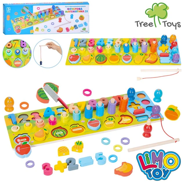 Дерев'яна іграшка Багатофункціональна дошка MD 0854 цифри, кільця, фрукти