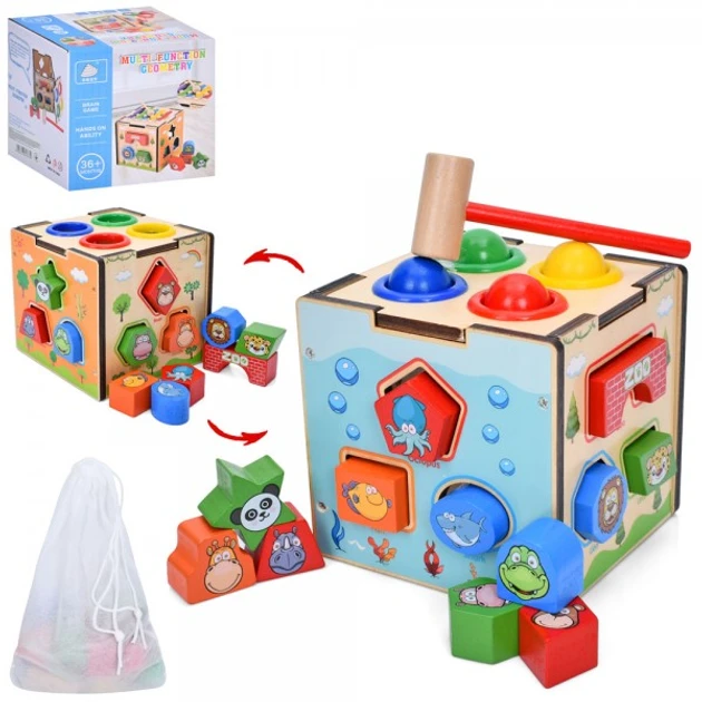 Дерев'яна іграшка Центр розвиваючий куб,сортер,фігури 12шт,стукалка,кульки 4шт MD 0828