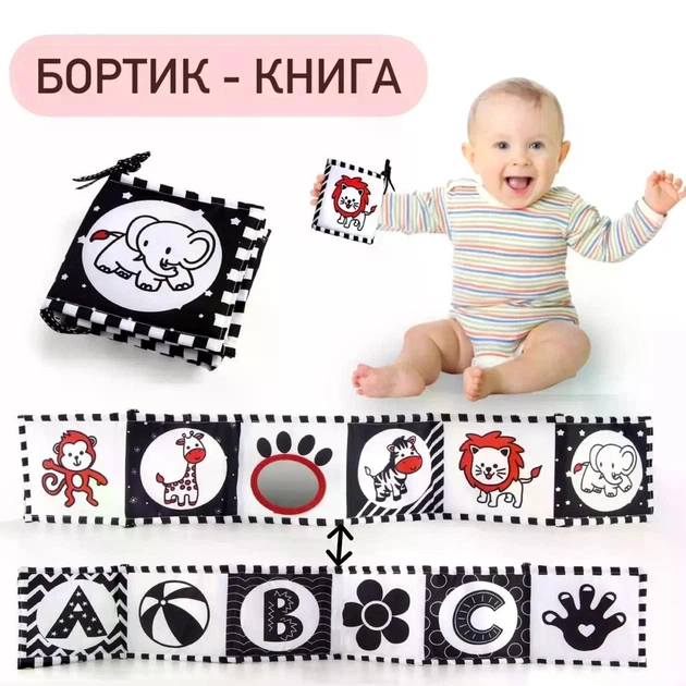 Бортик-книжка Квіточка на ліжечко двостороннє, розвиваюча, контрастна, книжка-розкладачка для немовлят