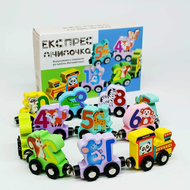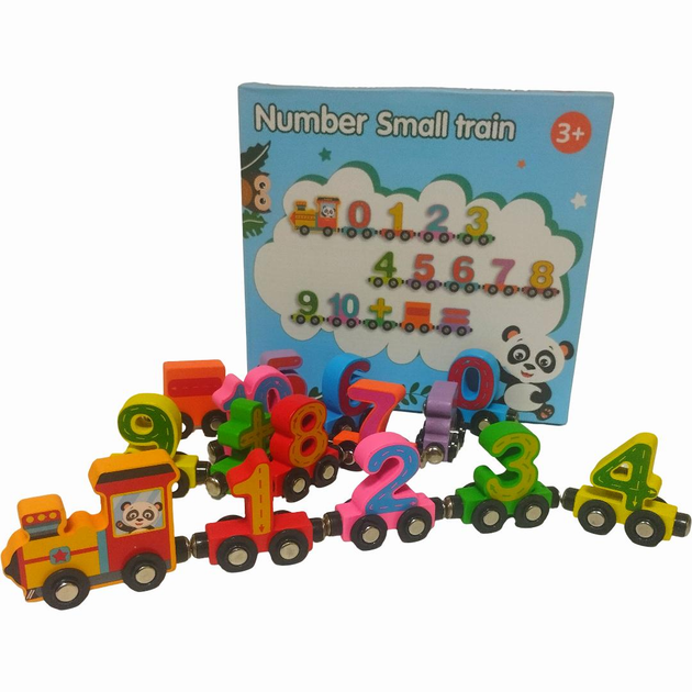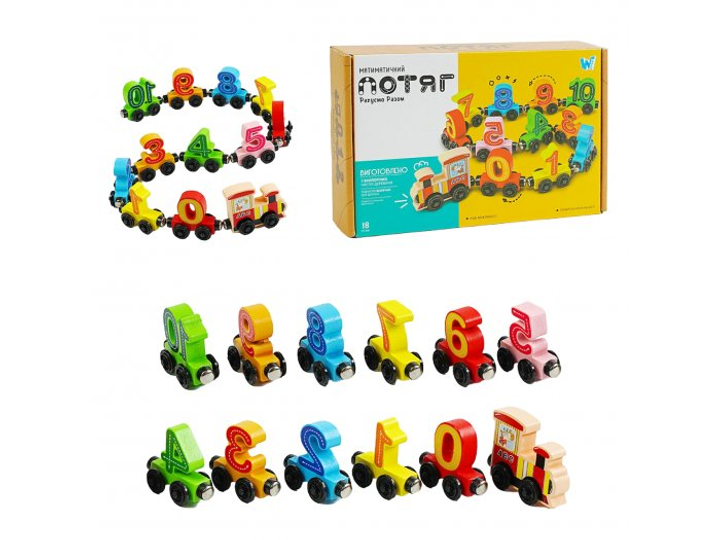Дерев’яний магнітний потяг з цифрами Весела математика магнітне з’єднання, 11 вагонів WToys 179108