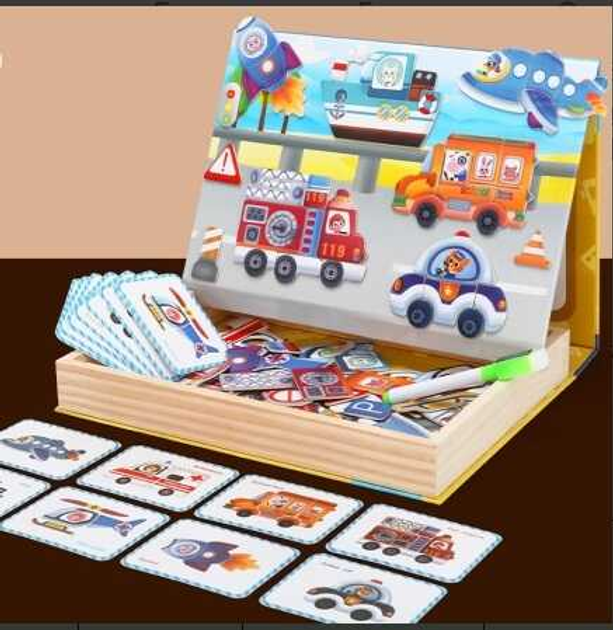 Дерев'яна магнітна дошка C 74014 “Транспорт”, картки із завданнями, дошка пиши-стирай, в коробці