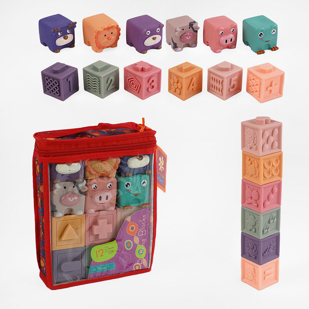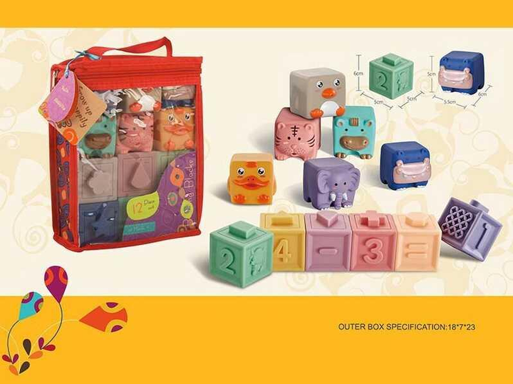 Сенсорні кубики 9989 Е 12 штук, тварини, математичні знаки в сумці