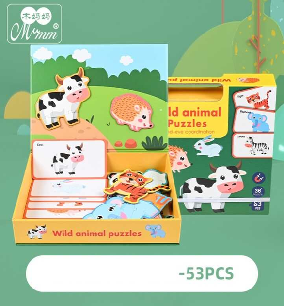 Дерев'яна магнітна дошка C 74612 "Тварини", дерев'яні пазли, картки, назви англ. мовою, 53 елементи, в коробці