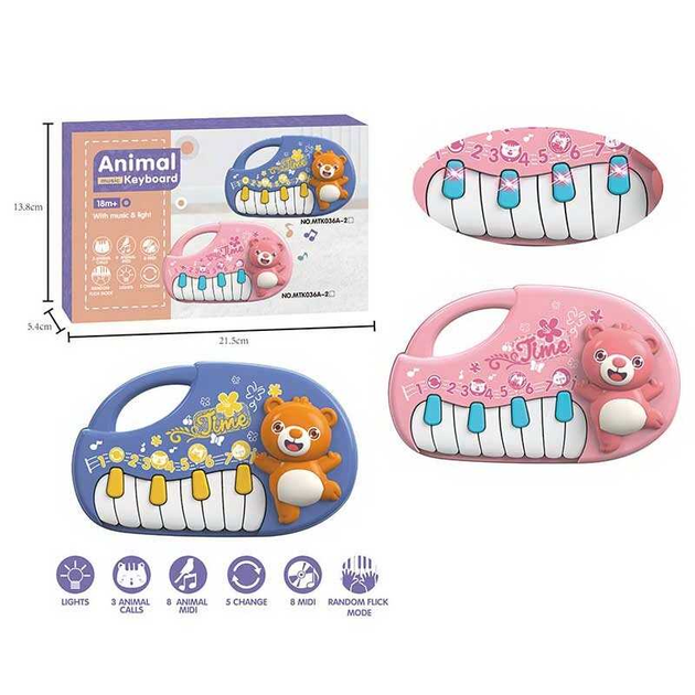 Піаніно MTK 036 A-2 2 кольори, на батарейках, звуки тварин, підсвічування, режими, звук, в коробці