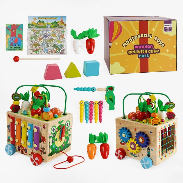 Куб логічний, каталка, годинник, ксилофон, сортер, шестерні, морквяні грядки, черв’ячки, пальчиковий лабіринт