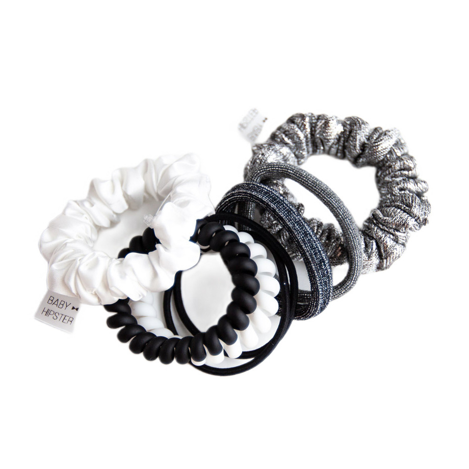Набір резинок Baby Hipster — красивий аксесуар, який доповнить будь-яку зачіску. В набір входять резинки-пружинки, які часто використовують як браслет, а також набір тонких резинок, які дуже гарно тримають волосся, а також оксамитова резинка і маленька резинка мікрофібра. Резинки підходять для дорослих та маленьких дівчаток, не перетискають волосся, але водночас гарно тримають.