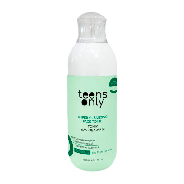 Тонік для обличчя Teens only Super-cleansing face tonic - призначений для глибокого доочищення шкіри обличчя soon-teens, що може вже мати перші прояви підліткових висипань. Містить Octopirox, екстракти шавлії та гамамелісу, які запобігають появі нових висипань, сприяють загальному заспокоєнню подразнень і відновлюють рівень зволоженості шкіри. Спосіб застосування: нанесіть невелику кількість тоніка на ватний диск; обережно протріть шкіру обличчя після того, як її очистили; використовуйте вранці та ввечері з пінкою сироваткою щоб досягти найкращого результату. Об'єм: 150 мл. Рекомендовано для дітей від 11-ти років.
