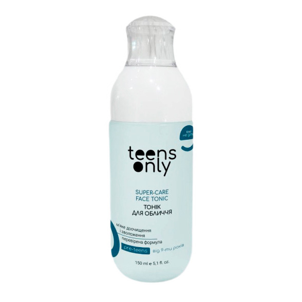 Тонік для обличчя Teens only Super-care face tonic призначений для м’якого доочищення та зволоження шкіри обличчя pre-teens. Містить комплекс TEQACTIVE (HaB)3, який сприяє відновленню рівня зволоженості шкіри, запобігаючи її сухості та лущенню. Спосіб застосування: нанесіть невелику кількість тоніка на ватний диск і обережно протріть шкіру обличчя після етапу очищення; використовуйте вранці та ввечері з пінкою і сироваткою щоб досягти найкращого результату. Об'єм: 150 мл. Рекомендовано для дітей від 9-ти років.