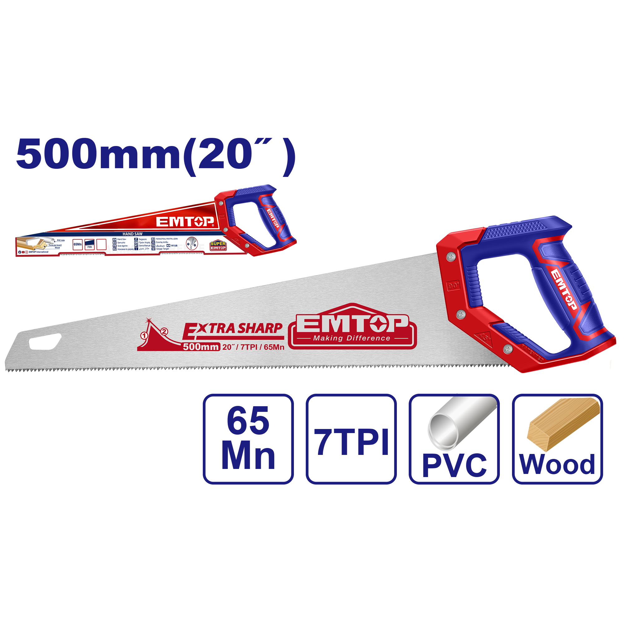- Розмір: 500 мм/20" - Товщина: 0,9 мм, 7TPI - Матеріал: 65 Mn - З особливо гострими зубцями: так - З протектором для зубів: так - Триколірна м'яка ручка: так - Термооброблена: так - Вага бутто: 0,6 кг