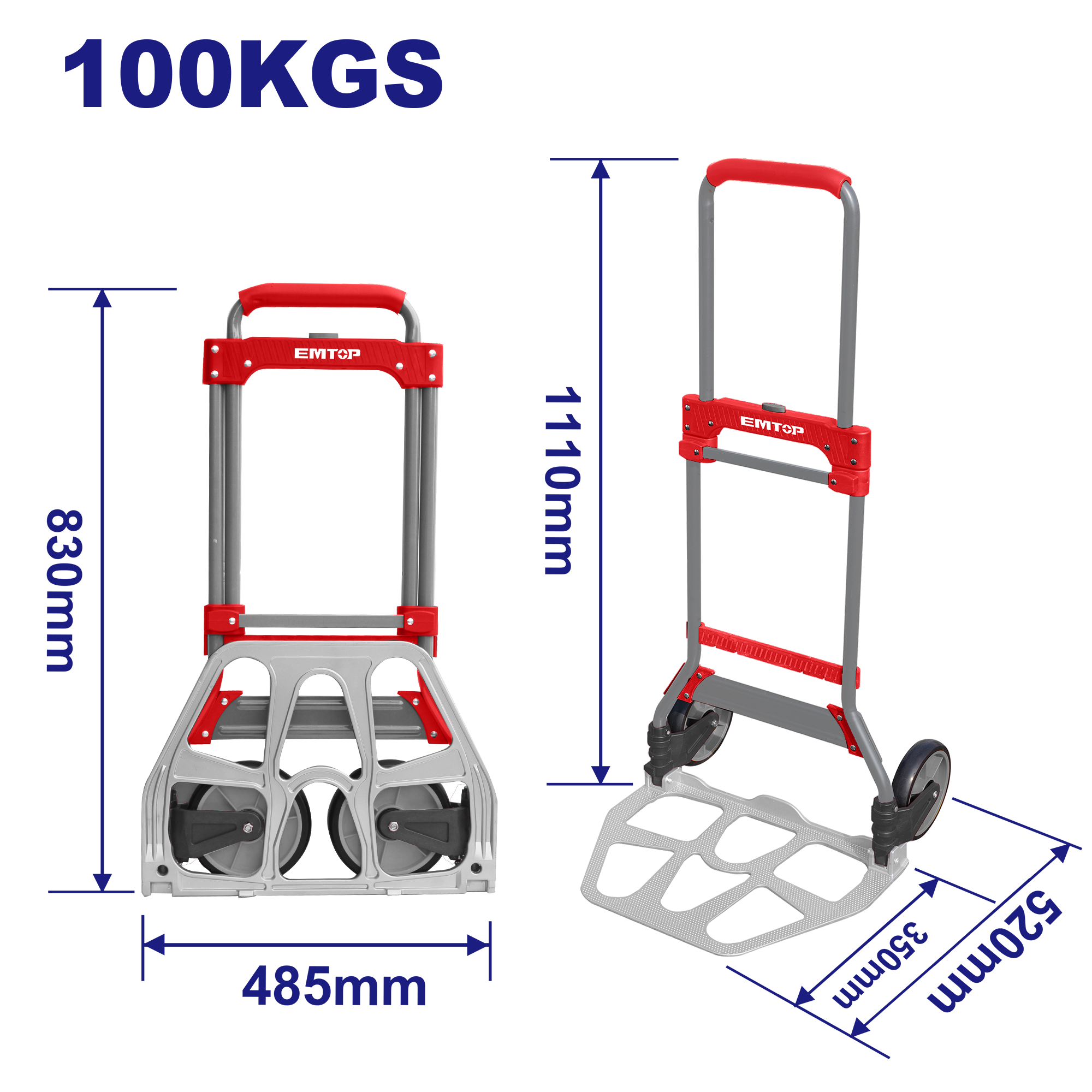 - Вантажопідйомність: 150 кг - Матеріал: алюміній + сталь - Розмір в розкладеному вигляді: 710x420x950 мм - Розмір в складеному вигляді: 530x420x230 мм - Колеса: 100 мм (PP+TPR) - Вага брутто: 8,80 кг