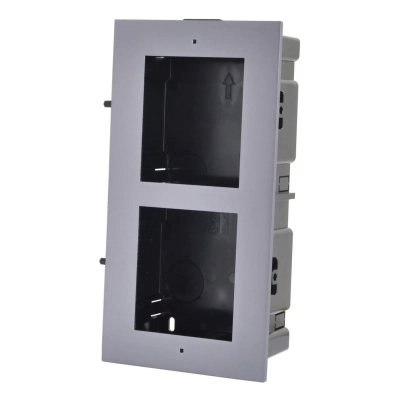 DS-KD-ACF2/S - двосекційна панель з рамкою, призначена для монтажу модульних терміналів та розширювачів Hikvision. Має квадратні вирізи для обладнання. Складається із пластикової основи та металевої накладки. Передбачає розміщення відеопанелей та зчитувачів у підготовлене поглиблення. Так, щоб інтерфейси розташовувалися лише на рівні стіни. Відрізняється надійною фіксацією та продуманою конструкцією. Робоча температура досягає -40°C та +55°C. Можлива експлуатація за різних діапазонів вологості. Матеріали не бояться опадів, вітру та інших дій. DS-KD-ACF2/S робить техніку компактною та естетичною, залишаючи на поверхні основну частину домофонів, і сховавши проводку з корпусом.