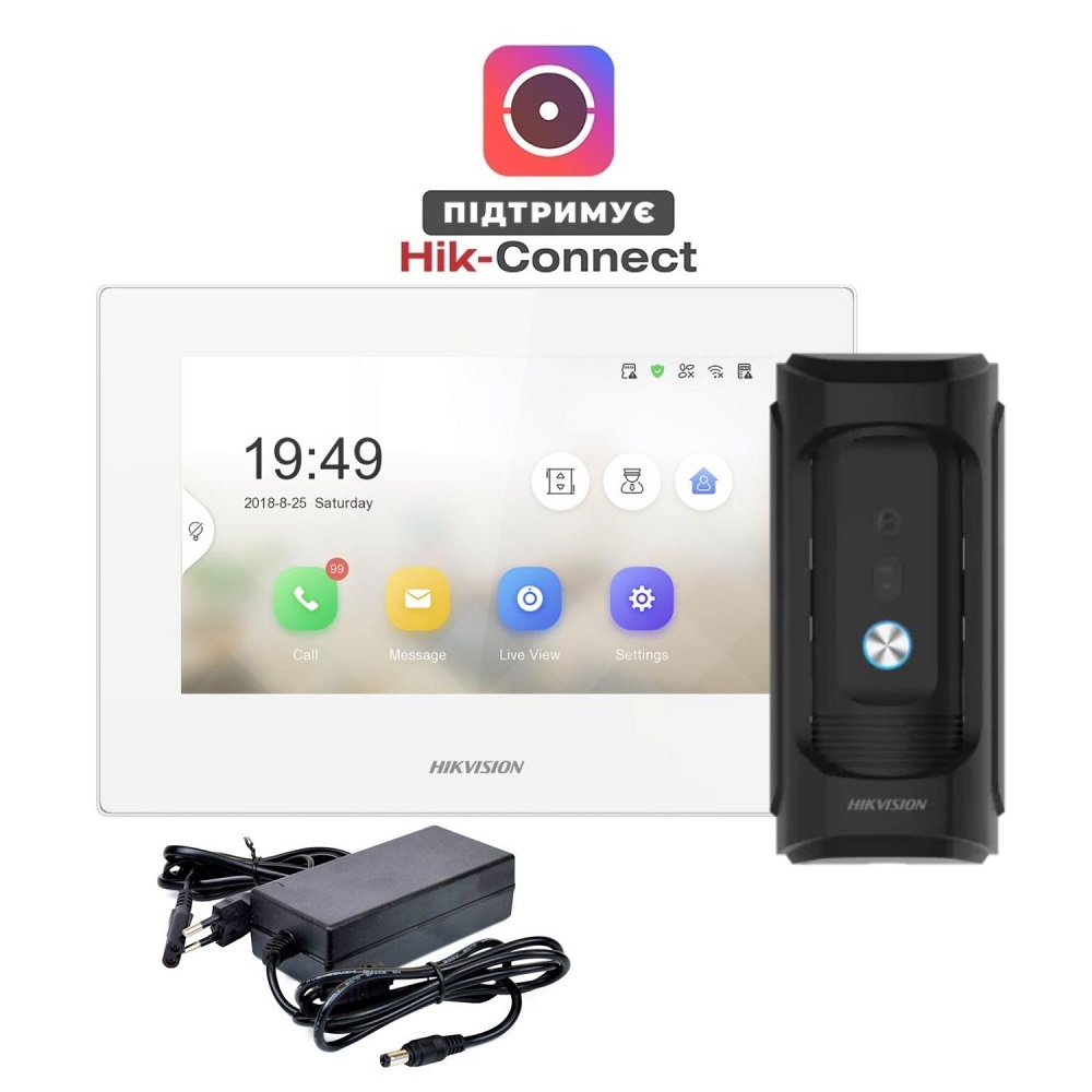 (С)+HS-TF входять: кольоровий Wi-Fi відеодомофон 7" Hikvision DS-KH6320-WTE1 WHITE - 1шт; Wi-Fi панель виклику Hikvision DS-KV6113-WPE1(C) - 1шт; PoE комутатор Hikvision DS-3E0105P-E/M(B) - 1шт; карта пам'яті MicroSD на 32 Гб - 1шт. Характеристики відеодомофона Hikvision DS-KH6320-WTE1 WHITE: Операційна система Embedded LINUX OS ROM/RAM 128Мб / 32Мб Дисплей 7 " Роздільна здатність дисплея 1024x600 Метод роботи сенсорний екран