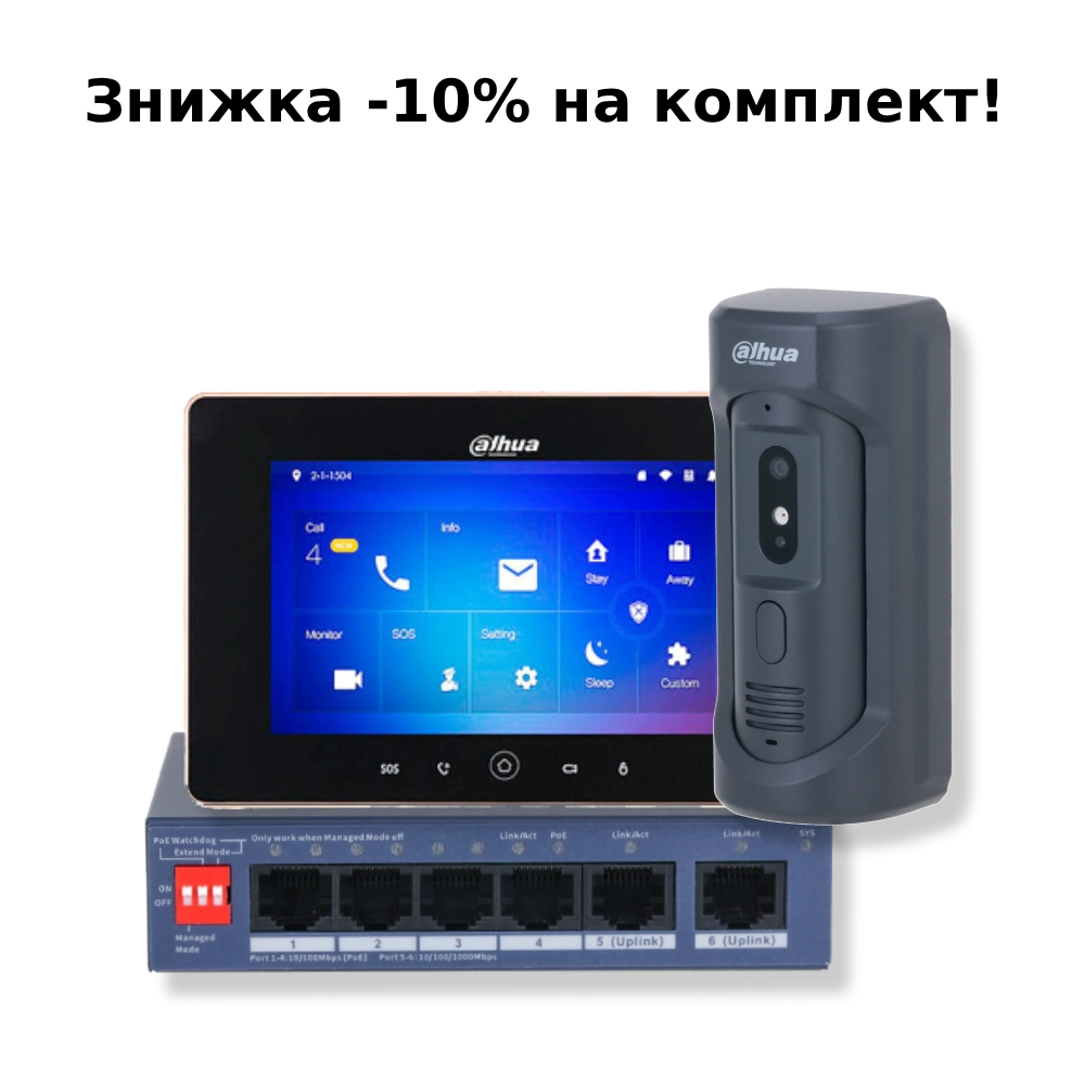 Комплект відеодомофону Dahua KIT(vandal proof) - black - для входів, де надійність є пріоритетом. Це готове рішення робить двері максимально контрольованими. Відвідувачів видно і чути відразу, дзвінок не губиться у шумі. Керування просте, інтерфейси зрозумілі навіть без досвіду. В комплекті: DHI-VTO2101E-P-S2 IP65 IK10 Виклична панель Dahua, DHI-VTH5221D-S2 Відеодомофон, Dahua DH-CS4006-4ET2GT-36 PoE Комутатор 4 порти керований.