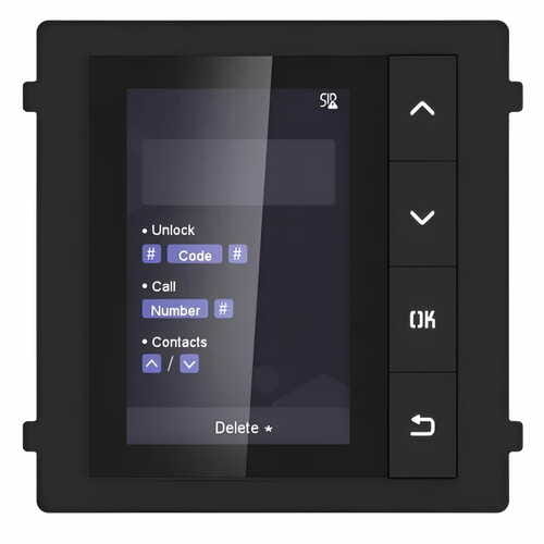 DS-KD-DIS — розширювальний модуль з монітором, призначений для використання з панеллю виклику Hikvision. Істотно розширює стандартний функціонал. Сумісний з DS-KD8003-IME1. Накладний або термінал чорного кольору, що врізається, оснащений дисплеєм, а також чотирма фізичними кнопками. Використовуючи DS-KD-DIS, можна набрати номер конкретної квартири або офісу або увійти самостійно, активувавши